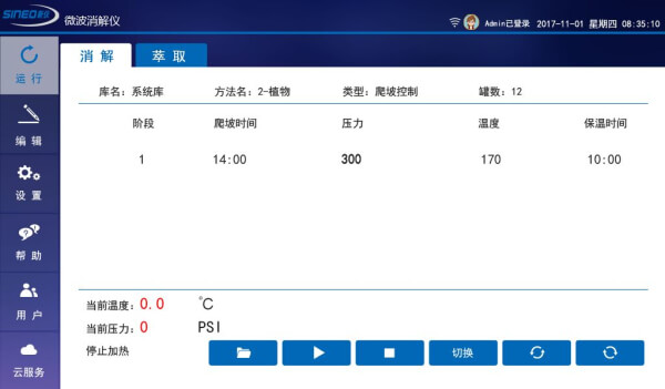 TANK PLUS使用ucos+安卓操作系統(tǒng) 運行穩(wěn)定可靠,采用7寸液晶彩色觸摸屏,觸控操作流暢簡便。頁面實時顯示工作狀態(tài)及溫壓變化曲線。內(nèi)置專家方法庫,可自行編輯及存儲用戶方法,也可以從云服務(wù)方法庫下載其他共享方法。內(nèi)置COT實時溫壓異常監(jiān)控系統(tǒng)能夠在任何一個反應(yīng)罐出現(xiàn)溫壓異常時自動報警并切斷微波從而保護儀器安全。裝有內(nèi)部攝像頭可實時監(jiān)控爐腔內(nèi)消解罐運行情況。